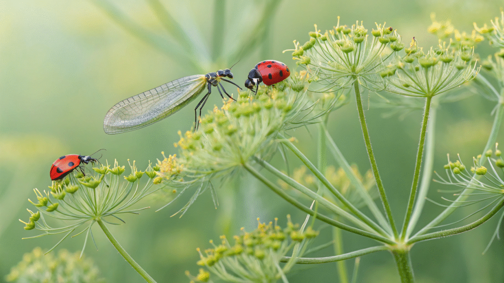Dill is one of the best companion plants you can grow. Its umbrella-shaped flowers are magnets for beneficial insects, specifically predatory wasps and ladybugs, which hunt down garden pests like aphids and spider mites. By planting dill near your cabbages or lettuces, you are essentially hiring a natural security detail for your vegetables.